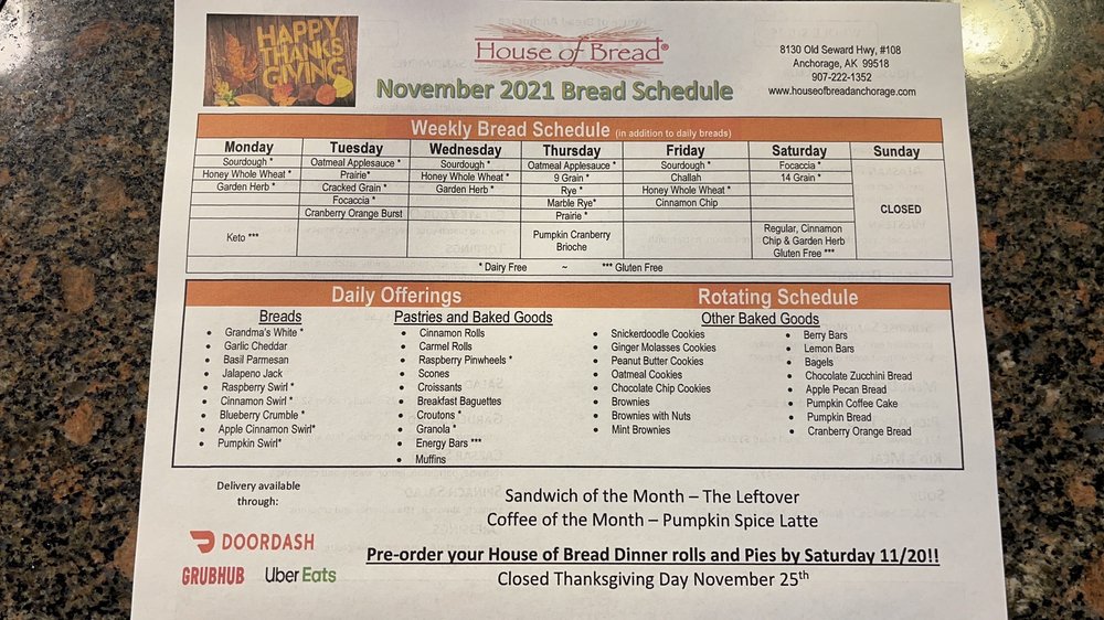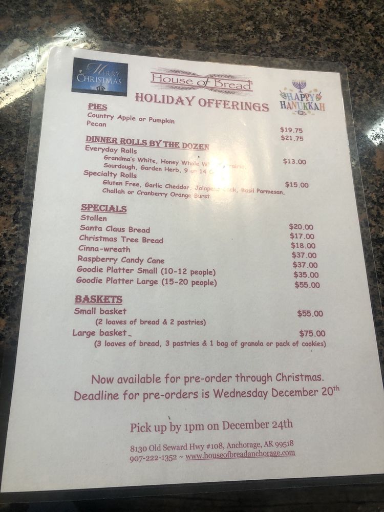 House of Bread Bakery, located in Anchorage, AK, offers a wide variety of freshly baked goods and delicious dishes. Specializing in bread, their core bread options include unique flavors like Apple Cinnamon Swirl, Basil Parmesan, and Keto Bread. Customers rave about the Jalapeño and cheese bread, perfect for sandwiches. The bakery also offers a tasty selection of pastries, such as Berry Bars and Lemon Bars. For breakfast, indulge in options like the Bacon Flatbread or French Toast. Known for their fresh and natural ingredients, House of Bread Bakery caters to both sweet and savory cravings. Whether you're looking for a quick bite or a catered event, this bakery has something for everyone. Don't miss out on their Alaskan fusion Paninis and unique Christmas bread designs. Visit or order delivery to experience the delicious offerings at House of Bread Bakery.